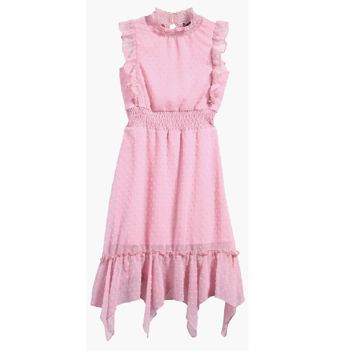Party perfect, this smocked-waist dress brings plenty of texture and flounce with tufted Blush clip-dot chiffon, frilly ruffled trim and a handkerchief hem. Perfect for tweens and young girls!
